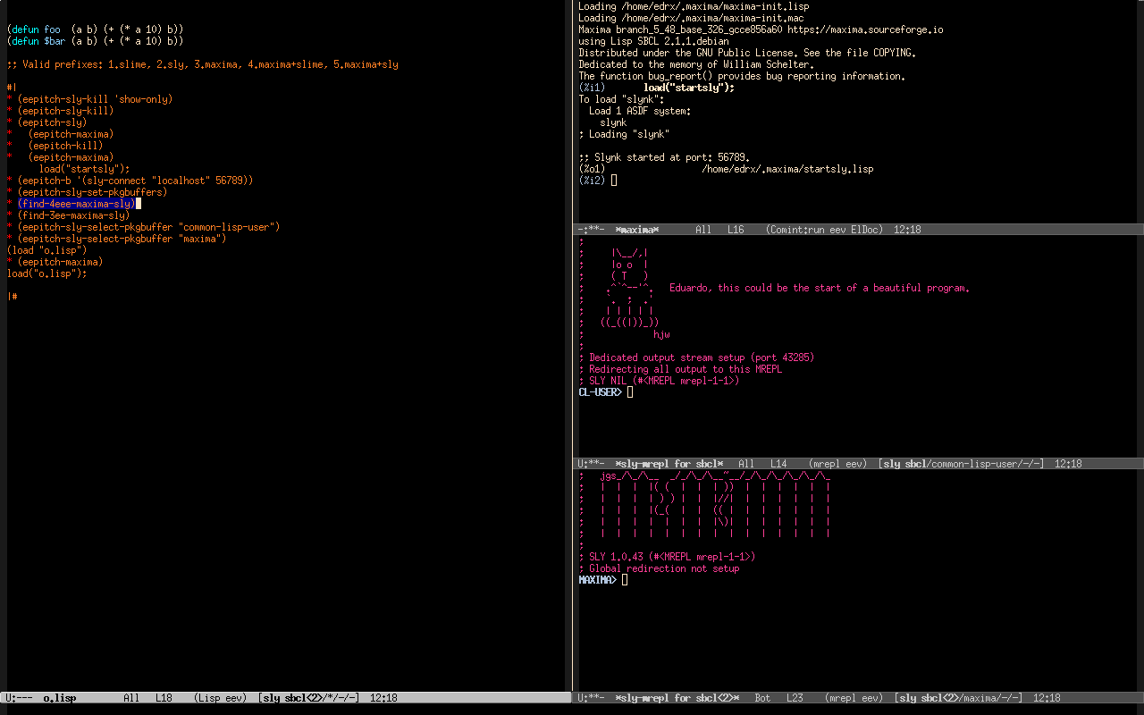 it will work as eepitch block, even if its "•"s become "•"s. To control the color of bullets in Emacs, run `M-x find-red-star-links'. 10. Making eepitch ignore certain prefixesThis is a hack that I implemented in dec/2021. I explained it in this page, that is mostly about how to use eepitch blocks in makefiles, and in the section about the function `eepitch-preprocess-line' in (find-eepitch-intro). In apr/2022 there was a discussion in the eev mailing list about the default behavior of `eepitch-preprocess-line'; my main messages were these ones: 3, 9. 11. Eepitch on M$ WindowsOn Windows many of the "other targets" don't work. See this question that I sent to help-gnu-emacs, and eev-wconfig. 12. Badly-behaved targetsSee the page on this video: "Badly-behaved targets, or: eev, Slime, Sly, and Maxima". Here are two screenshots: Note: I created this page in 2022jun05 because I discovered that when people googled for just the word "eepitch" Google would suggest pages that were hard to understand... I still need to add lots of things here. |