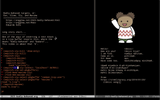 That's it! 🙂 Note that I consider <f8> as "the fourth of the three main keys of eev"; the three main keys are M-e (evaluate/execute), M-j (eejump), and M-k (kill buffer). The two most beginner-friendly ways to see the list of keys of eev are: 1) click with the middle mouse button on the "eev" in the mode line; this will show a help buffer like the one in the left half the screenshot below, and 2) type `M-2 M-j' - this will show (find-emacs-keys-intro), as in the right half of the screenshot below. Note that both halves of that screenshot have lots of elisp hyperlinks. To follow an elisp hyperlink, type M-e; to go back, (usually) type M-k. If the keybindings in eev-mode interfere with your usual keybindings you can use `M-x eev-mode' to turn eev-mode on and off. 4. TutorialsI have a few "eepitch-based tutorials" that are made mostly of executable examples (in eepitch blocks) and links to real tutorials (in sexp hyperlinks). There is a big one for Lua here, a small one for Python here (it uses eev-rstdoc.el), and I am starting to write one for Eshell. See: 1) this message to help-gnu-emacs in which I asked for snippets, 2) this block of examples, and 3) click on the thumbnail below to see a screenshot. 5. Comparison with Org ModeOrg mode includes support for both executing and exporting "code blocks". Eepitch can be used as a very lightweight alternative to the "executing" part - all these targets work out of the box, and adding a new target usually takes just one line of code - but eev and eepitch don't have support for "exporting" in Org's sense (1). Org files are exportable. This means that they need by parseable, and that Org needs to be also a markup language... and it turns out that Org's markup language is quite hard to parse: see Karl Voit's work on Orgdown for details. In contrast, eev works on files that are free-form, and that can be any mix of code, text, lines with sexp hyperlinks, eepitch blocks, Org markup, and whatever else; here's a simple example. To make eev follow the sexp hyperlink in the current line we type M-e, and to make eev "execute" an eepitch block, we type f8s on the lines that we want to execute; that's it. M-e and f8 usually only care about the current line (2). Here is an example of how to use eev's "markup language" inside an Org file: