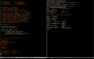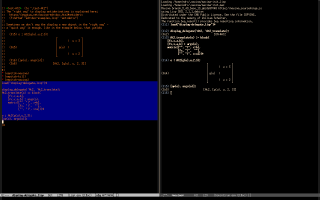 Here's how I'm (sort of) teaching Maxima to these "students who have never seen a terminal in their lives". I start by convincing each of them - each of the interested students; my classes are small - to do a first 5-minute workshop on my laptop in which they run they run the eepitch block in blue in the first screenshot below with `f8's, and they get a Gnuplot window, that they can close with `q'. Then they do a second 5-minute workshop, in which they first type `M-e' to execute the `(find-es ...)' in the upper left window of the second screenshot above; the `M-e' takes them to a wgetted copy of my notes on Maxima, and to this block,