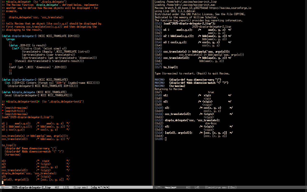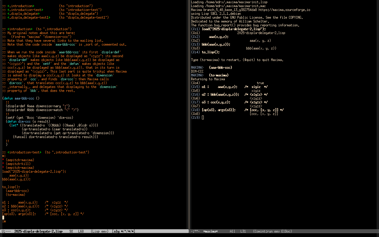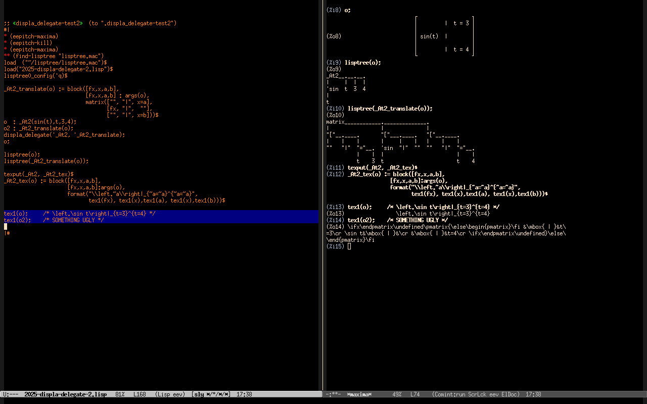 using matrices. The functions that I use to do the translation "in the right way" are in 2025-displa-delegate-2.lisp - see the screenshots below: By "in the right way" I mean "in a way that lets me configure independently how _At2 objects are displayed in `display2d' style and in `tex1' style" - see the third and the fourth screenshots above. 13. Debugging the Lisp (with Sly)Most people use Slime and Swank to debug the Lisp code of Maxima. I couldn't make Slime work with eepitch, so instead of Slime and Swank I'm using Sly, Slynk, and an eepitch-sly defined in this way, and I had to adapt these instructions. My code to use Sly and Slynk in Maxima is here: ~/.maxima/startsly.lisp. My tutorial for making Sly work with Maxima is here: (find-try-sly-intro). Its last section -