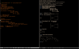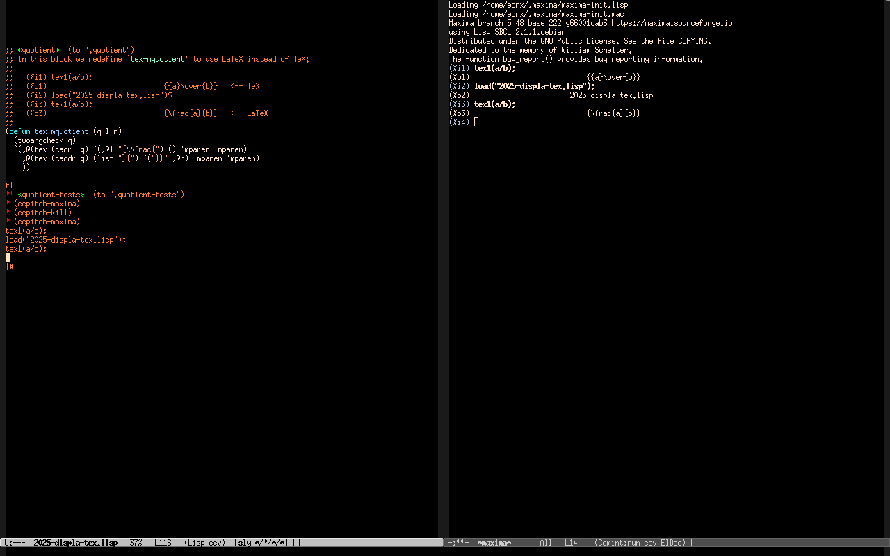 The fourth screenshot shows this library for (joined) lerps. 6. Embedding in LaTeXMy current way of LaTeXing Maxima code uses Lpeg. Its main module is here, Maxima2.lua, and it produces output like this from this input (plus tweaking). The rest of this section describes an older way. Here is an example of how I am embedding Maxima code in LaTeX files; the trick that makes eepitch ignore a prefix is explained here. If I execute that eepitch block skipping the lines "load" and "display2d" I get a human-friendly output, as in the first screenshot below; if I execute the lines "load" and "display2d" I get an output that I can process with M-x emaxima-conv (that calls emaxima.lua) to obtain this LaTeX code, that becomes this in the PDF. This trick is based on the answers that I got for this question that I sent to Maxima mailing list; note that 1) I am using this copy of emaxima.sty that has two lines commented out, and 2) my emaxima.lua is a quick hack, and it should be converted to elisp at some point. 6.1. LaTeX instead of TeXBy default Maxima generates TeX code that is TeX-y instead of LaTeX-y - for example, if you don't change anything then `tex1(matrix([42]))' returns this: