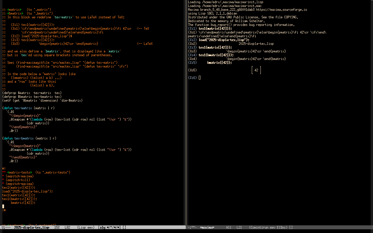 1. `eepitch-maxima'I use eepitch to send lines from Emacs to Maxima; see the figure below for the main idea, and my presentation at the EmacsConf2021 for the details. The definition of eepitch-maxima in eev is the simplest possible - just this: