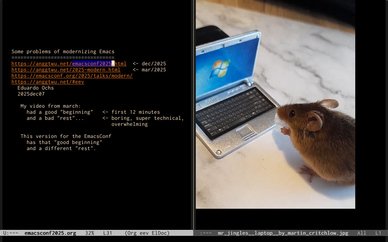 Some problems of modernizing Emacs (eev @ EmacsConf 2025)