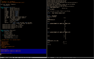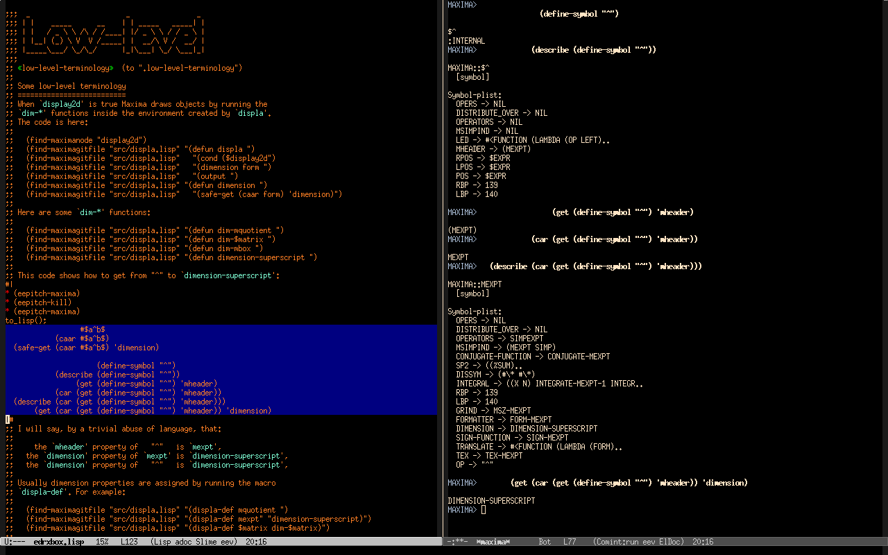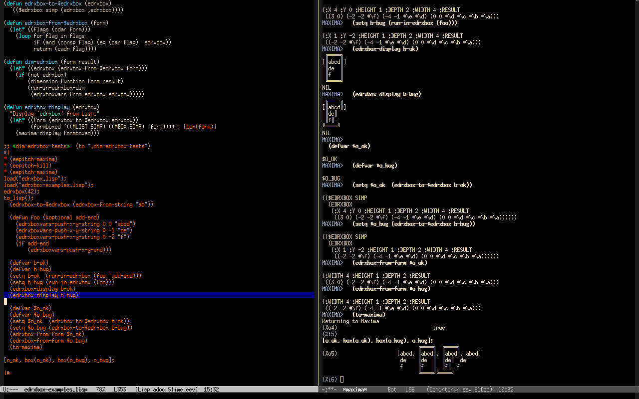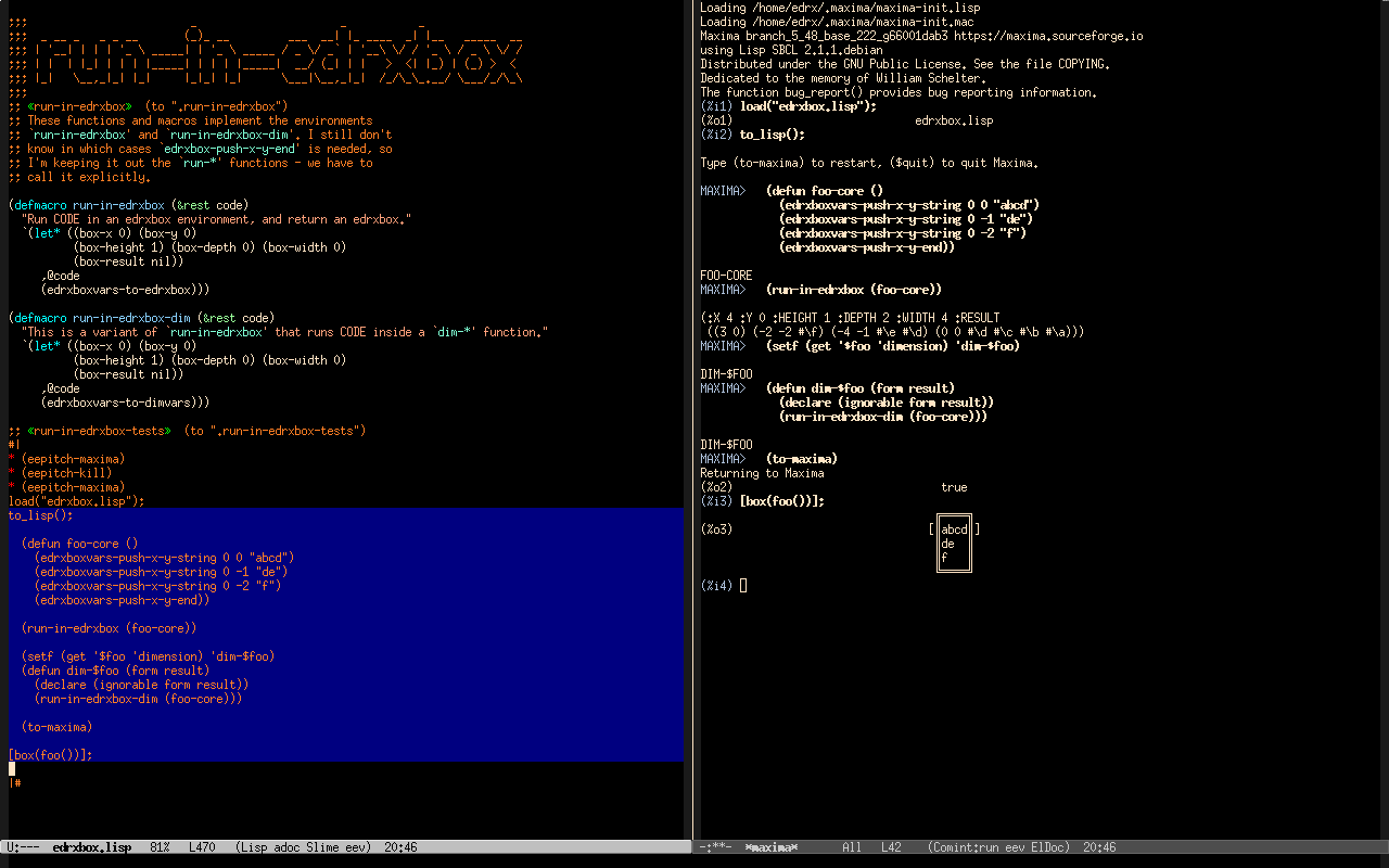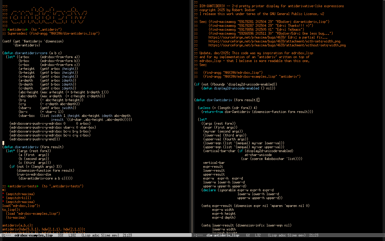 In Emacs they will point to specific lines in the Maxima source, like in this screenshot: but in the htmlized version of edrxbox.lisp their pos-spec-lists don't work, and the links point to the top of the files in the git repository. 4. The examples: edrxbox-examples.lispThe file edrxbox-examples.lisp is much more interesting... it has these examples: 4.1. VerbatimboxVerbatimbox is used by lisptree: Note what was needed to center the drawing around the baseline - just a call to `edrxbox-vcenter', that added a "move" command to the drawing instructions. 4.2. AntiderivThe first two screenshots below show `antideriv' and `hdw'. `hdw' creates a box with a certain height, depth, and width; I use it mostly to debug `dim-*' functions. The third screenshot below shows a comparison between the `antideriv' written with edrxbox and its antecessor, dim-antideriv.lisp: 4.3. UnderbraceThe next screenshot shows `underbrace' - note how the horizontal centering was done by just calling `edrxbox-hcenter' - and a demo that uses my substitution operator, `_s_', and these variants of it. The second screenshot shows how these underbraces are LaTeXed - see the introduction. 4.4. Displaying edrxboxesRemember that in a previous section we saw a debugging function, `edrxbox-from-form', that displays the drawing instructions for a given Maxima object. Here is its screenshot again: The next example is another debugging function, `edrxbox-display', that receives an edrxbox, converts its drawing instructions into a Maxima object - whose associated `dim-*' function is `dim-edrxbox' -, and makes Maxima display it. The conversion is explained in the first two screenshots below, ...and the third screenshot shows what can happen when we don't run `edrxboxvars-push-x-y-end' to move the current (x,y) position to the "right" ending place. This is related one of my motivations for writing edrxbox.lisp, by the way... see this bug report, that describes a similar bug that took us months to fix, and the explanations in the beginning of edrxbox.lisp, that have this paragraph:
