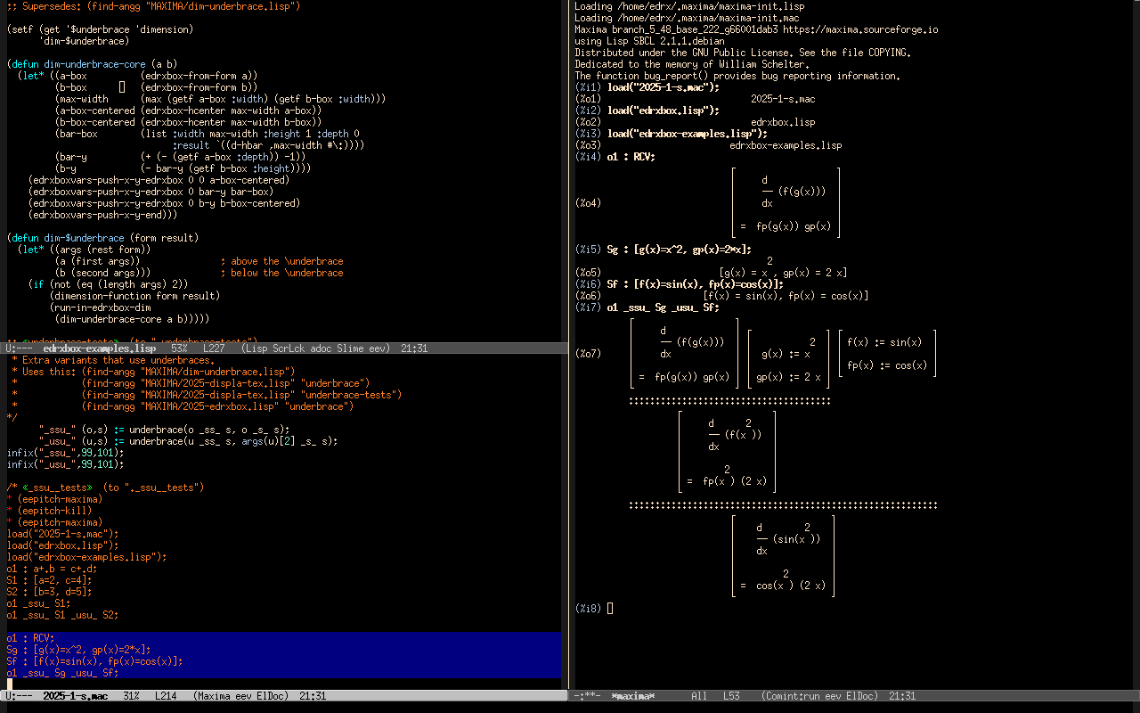 1. What is this?In Maxima we can define operations that are displayed and LaTeXed in special ways. Making `underbrace(a,b)' be LaTeXed as `\underbrace{a}_{b}', as in the first screenshot below, is very easy; making it be displayed as in the second screenshot, as something that looks vaguely like a fraction but in which the baseline is the baseline of the top object, is VERY hard. Look at this bug report, for example - it took me ages to understand dim-antideriv.lisp, and more ages to find a one-line fix that fixed its behavior in most cases. We need something better, like another way to write display functions... and I think that this is a step in the right direction. 2. Try it!If you have eev installed and activated - and Maxima, of course - you can try edrxbox by downloading its two files, edrxbox.lisp and edrxbox-examples.lisp, with something like these commands...